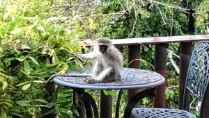 I will always remember these sunny mornings, woken to bird calls, stepping out onto the patio with the sun shining through the branches of the Cape Ash tree and the Stinkwood tree which grew so fast from all the shower water it received. Glancing up where the monkeys appeared swinging happily between the trees, visiting the compost and often also the vegie patch.