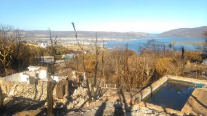 The Oak tree, the Swamp Cypress, Wild Plum tree, especially planted for the Loeries, the Hibiscus flowering in bright red and rose, the white rose shrub, the fynbos grasses, bulbs, and proteas, the old lavender bush, the confetti bushes, the tall Strelitzias, the Bougainvilleas along the fences, the majestic Pine tree, the little spiny Fever tree, which never really found its happiness in a non-endemic space. Plumbagos and Honeysuckle…. yes, so many different species, most of them indigenous and water saving plants, which did withstand the ongoing drought, now all gone with the fire. ALL of them, plants and animals and stones.