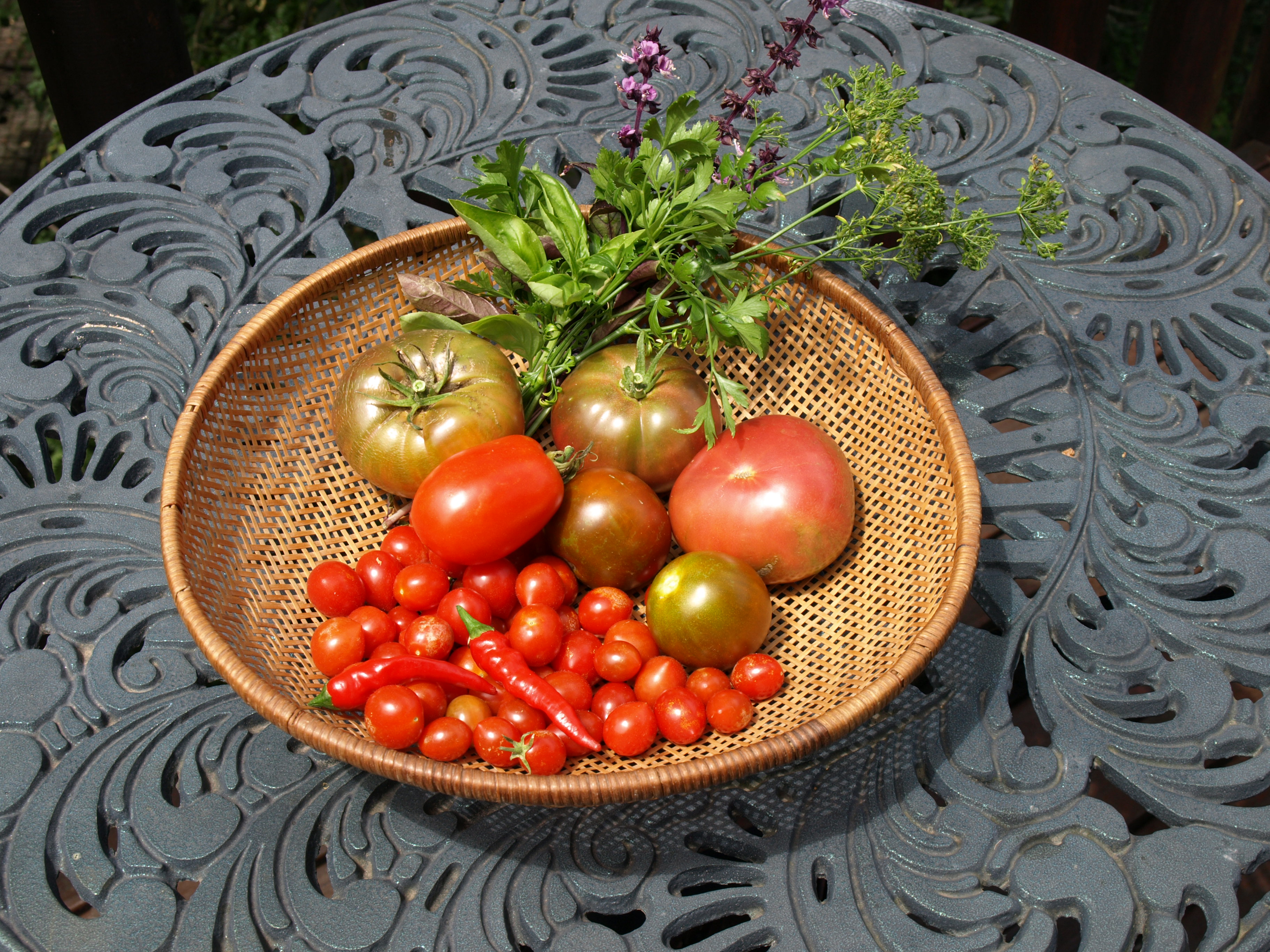 These are a few of the tomatoes the monkeys left for us. Luckily they do not eat chillies and are not very interested in basil and other herbs. The cocktail and plum tomatoes seeded themselves but the larger and medium-round brownish/green ones are from heritage seeds (“black krim” + “black seaman”) www.livingseeds.c